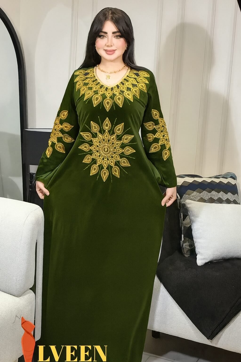 دشداشة نسائية راقية بقماش قديفة ناعم فخم، مطرزة بتطريز ذهبي بنقشة فنية على الصدر والأكمام، تصميم أنيق ومريح للاستخدام داخل المنزل أو للزيارات العائلية.